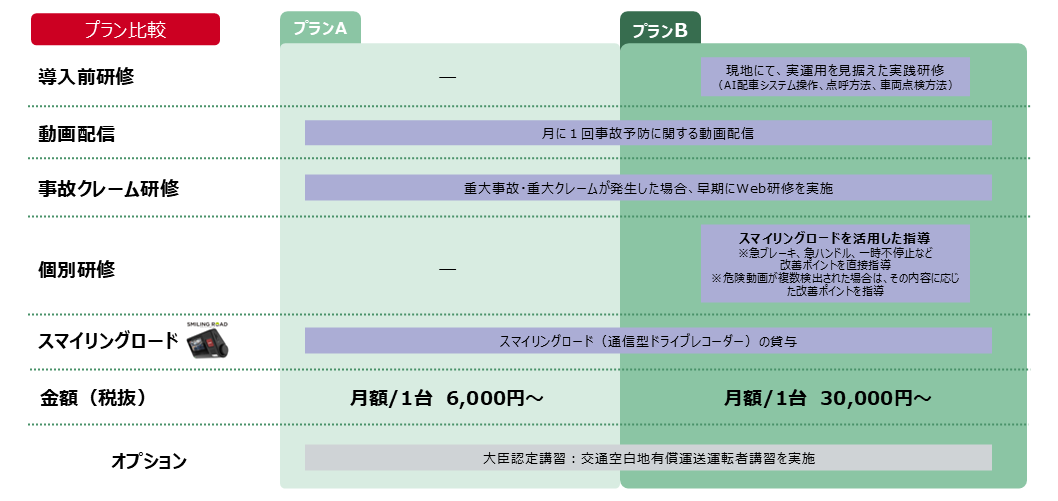 ・プランB:プランAに加え、システム操作や車両点検方法などの実践的な「導入前研修」や、「スマイリングロード」の運転スコアが低いドライバーへの個別指導を実施します。